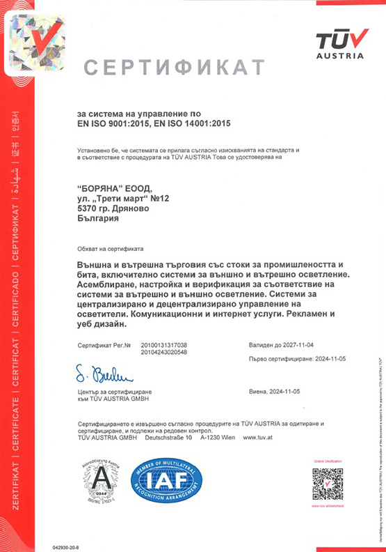 Фирма Боряна е внедрила и прилага система за управление съгласно БДС ISO 9001:2015